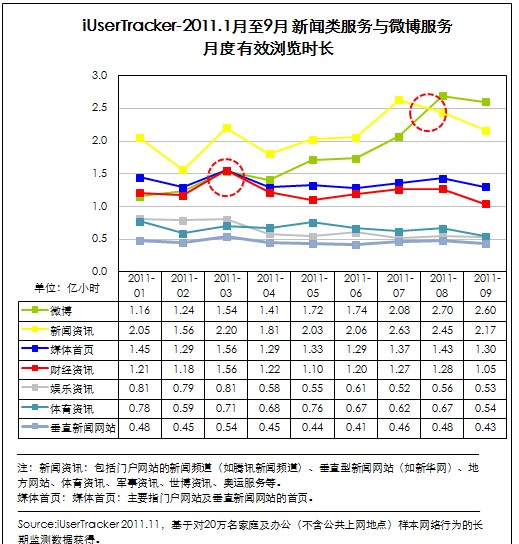 通过上图我们可以明显的发现,微博月度浏览量在2011年3月份首次超过媒体首页,并且呈现不断上升的良好势头,微博和新闻资讯在八月份分别是一涨一跌的走势,而且微博已经比前几个月增长了将近三成之多,到目前为至,微博一直是领先各大新闻咨询大类,成为名副其实的媒体新秀。