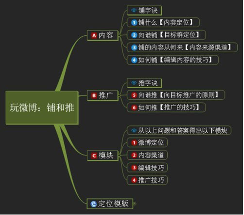 上图中下面的模块就是根据以上的分析从而得出的,只要我们把以上的六条弄清楚了下面相关的模块也就不必要做相关的重复分析了,如果你会淘宝店的经营之道那你也很容易就会微博营销相关方面的操作,淘宝店铺和微博营销是相辅相成的。
