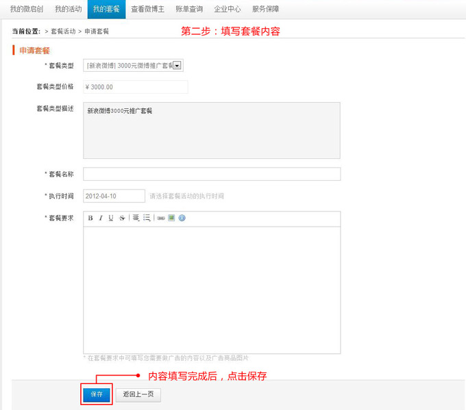 2、填写套餐内容