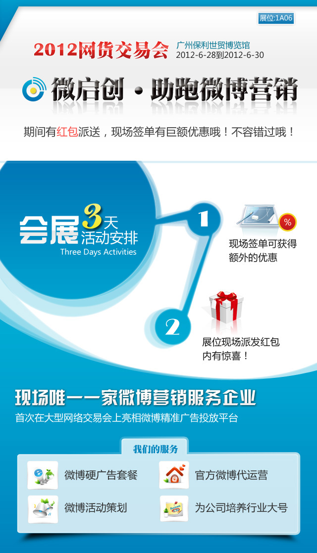 以“微启创”领衔的微博广告精准投放平台,将助跑微博营销市场,在烽烟四起的营销战场上,有我们与您并肩作战,抢滩属于你的一片新天地。2012年广州网货交易会我们与您相约。